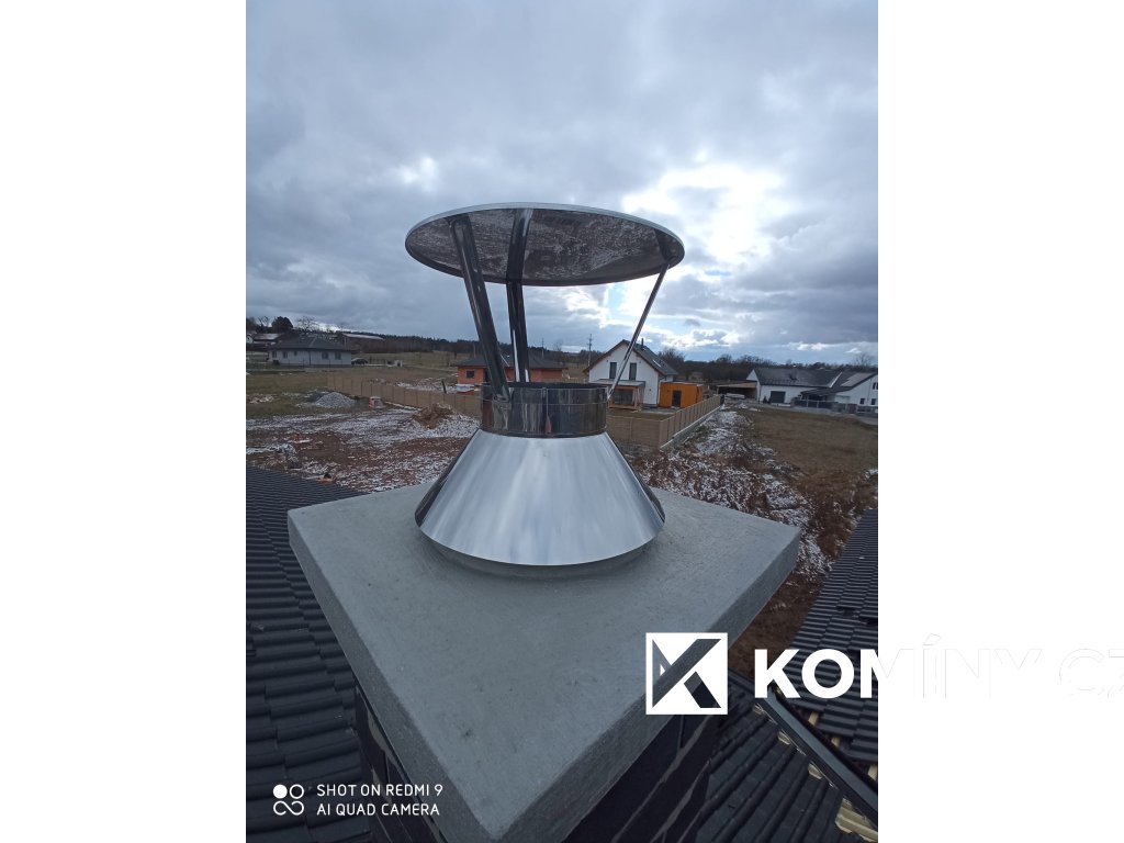 Nerezová stříška pro upevnění na nerezový ukončovací konus i nerezovou vložku.