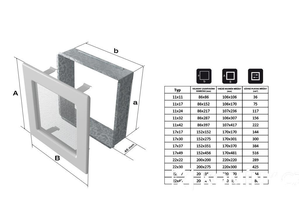 Údržba: Po odejmutí mřížky ze zazdívacího rámečku lze ošetřit jakýmkoliv běžným úklidovým prostředkem (nepoužívejte žíraviny, ředidla a rozpouštědla).