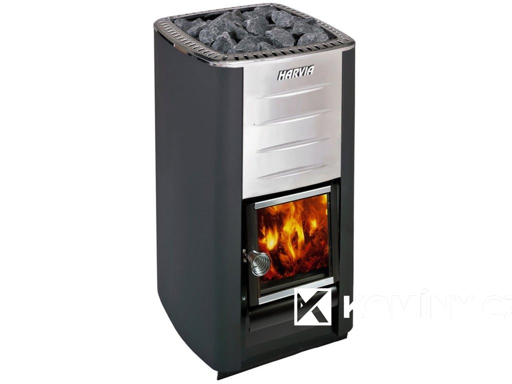 Kamna na dřevo jsou vybavena skleněnými dvířky, která dodávají nádech tradiční atmosféry finské sauny. Barva kamen je zvolena v elegantním černém grafitu. Přední plášť je vyroben z nerezu.