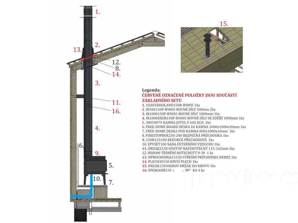 Set pro realizaci odkouření v Tiny Housu. Celková délka setu 3m. Aby majitelé Tiny housů nemuseli složitě kombinovat jednotlivé komponenty, vzniká kompletní topná sestava, která obsahuje:
